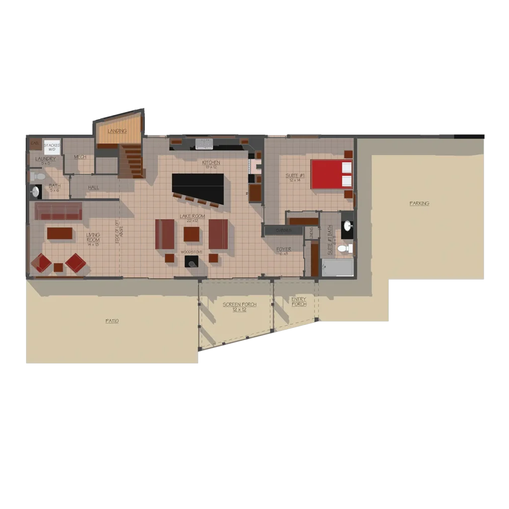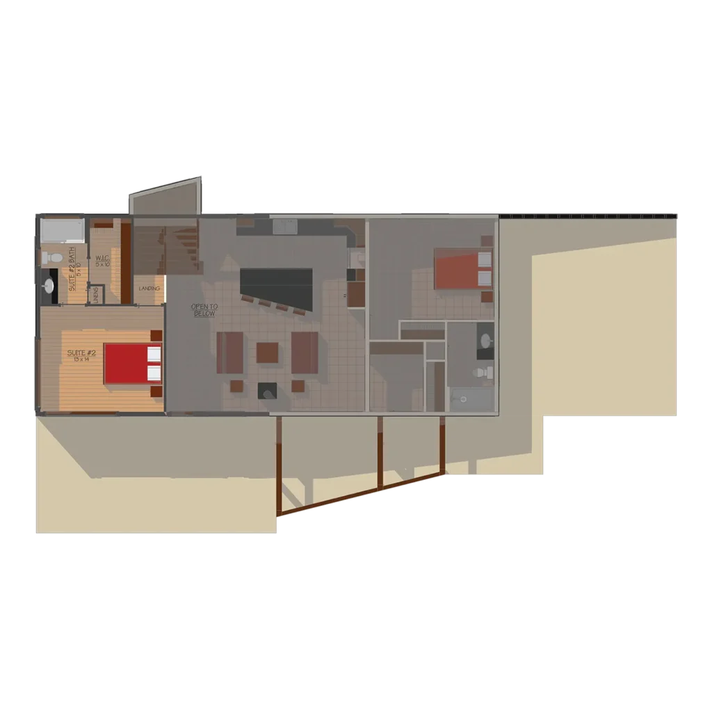 This custom home boasts a modern geometric exterior and floor-to-ceiling windows to allow plenty of light. The generous open floor plan boasts a connected kitchen, lake room, living space, and en suite. The second floor features a large loft with a second en suite open to the main floor below.